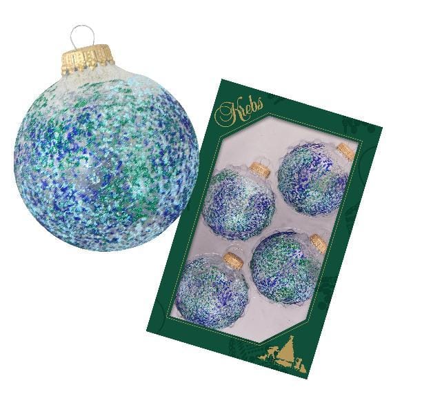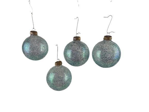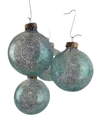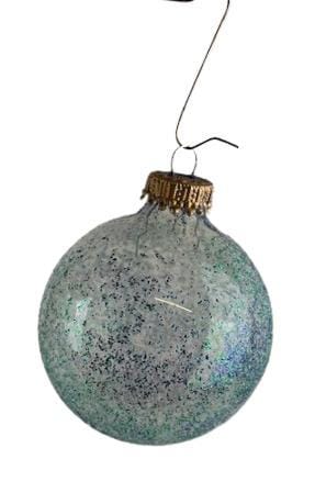 Het is een set met transparante ballen waar donkerblauwe en aquagroene glitters overheen zijn aangebracht.