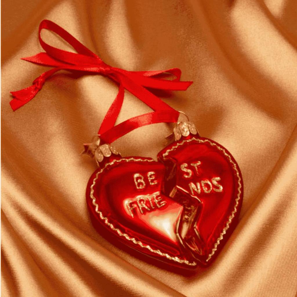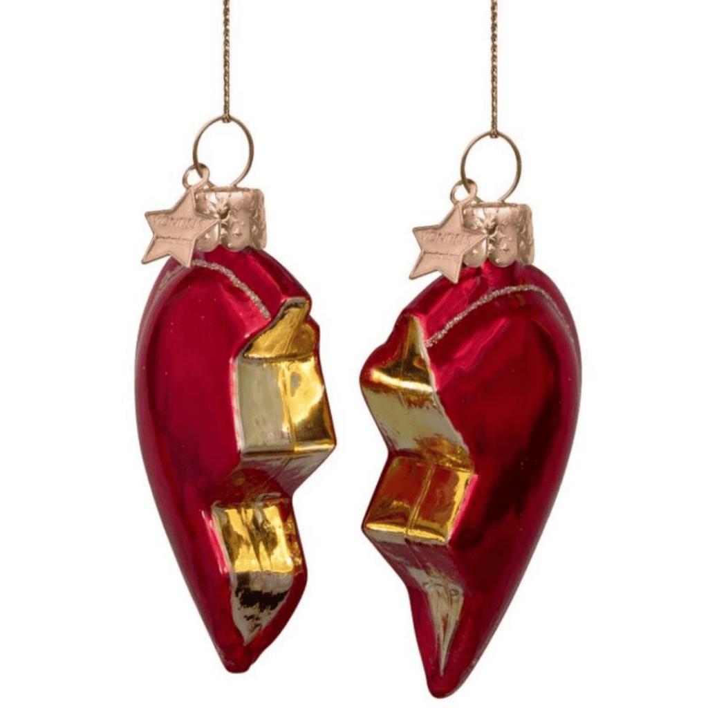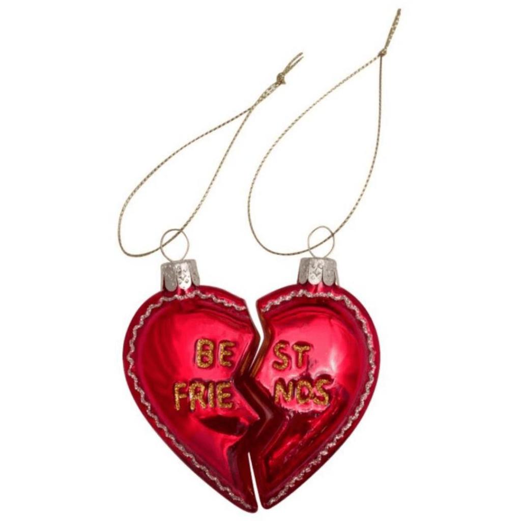 Een gebroken hart, maar dan met een gouden randje: deze kerstbalset van Vondels bestaat uit twee glanzend rode harthelften met de tekst "Best Friends". De ornamenten passen perfect in elkaar en vormen samen één hart – ideaal om te delen met je beste vriendin, broer, zus of zielsverwant.