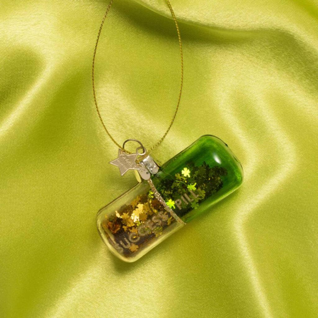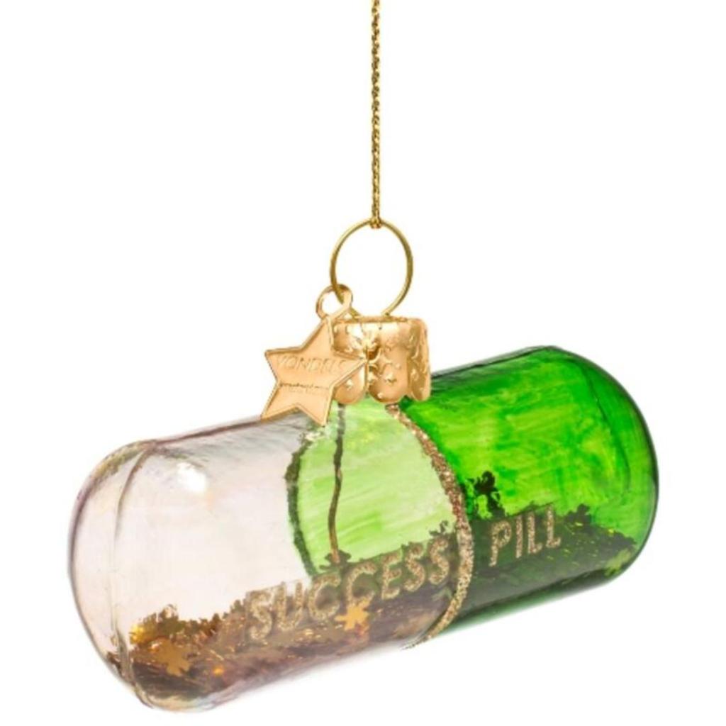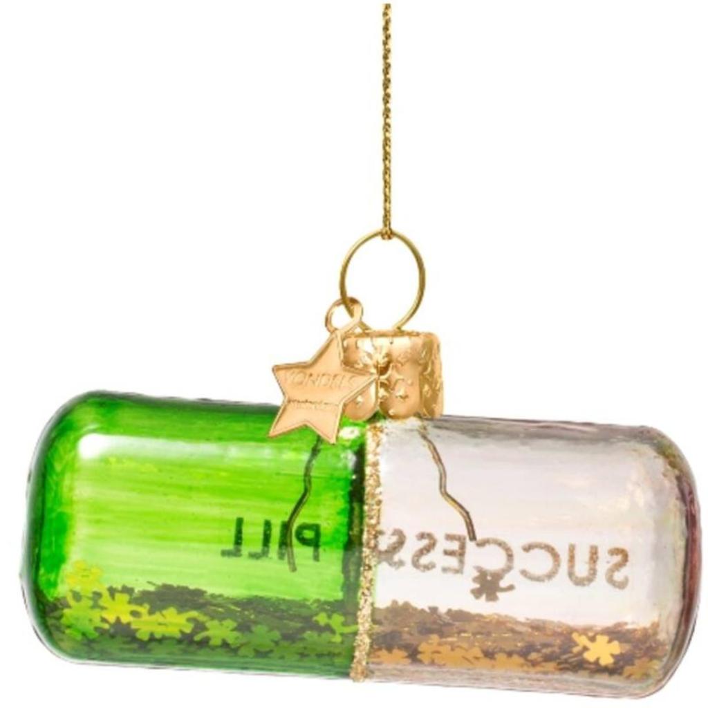 Deze kerstbal in de vorm van een Succes Pil is een echte knipoog voor in de boom. Gemaakt van mondgeblazen glas, met een helft in helder groen en de andere in transparant glas – gevuld met glinsterende gouden sterretjes. Aan de bovenkant hangt een gouden lus met het herkenbare Vondels-sterlabel. Een originele eyecatcher die positiviteit en humor brengt tijdens de feestdagen.