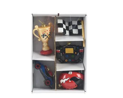 • Set van 5 ornamenten: raceauto, helm, stuur, vlag, trofee