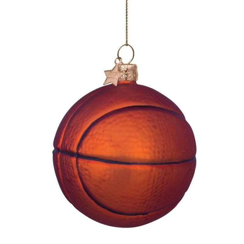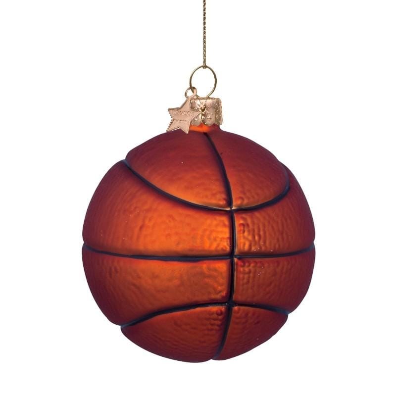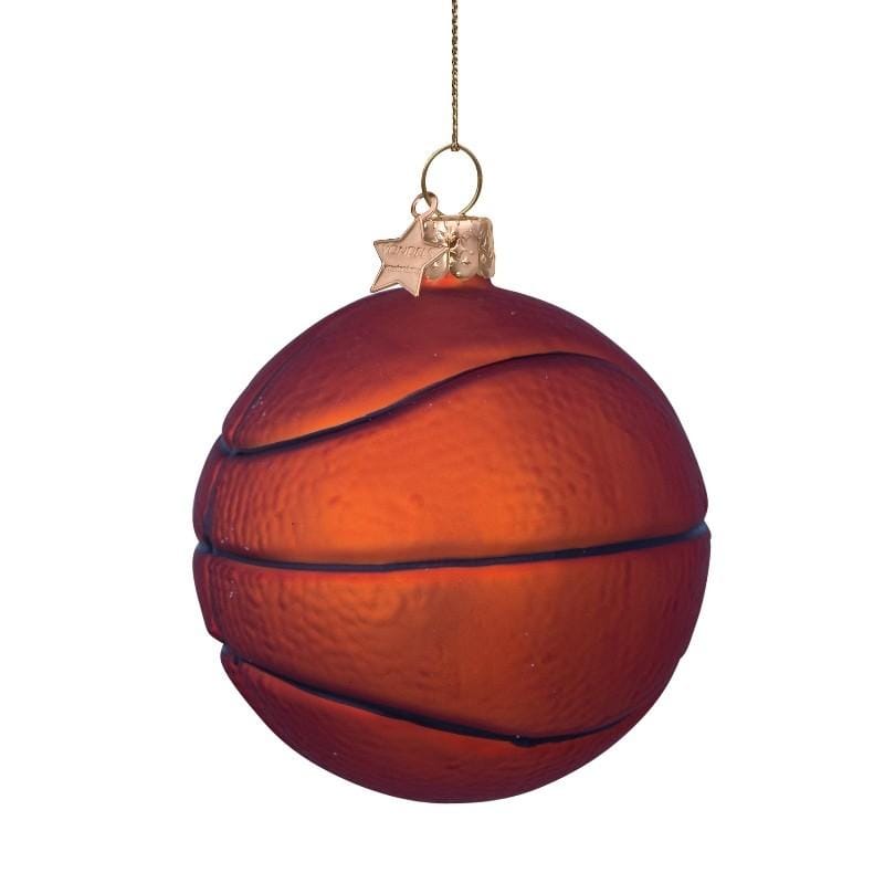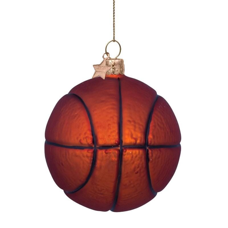 Deze kerstbal van Vondels is uitgevoerd als een klassieke basketbal, compleet met herkenbare belijning en een licht glanzende afwerking. De warme oranjebruine kleur en de realistische structuur maken dit ornament direct herkenbaar en verrassend leuk in de kerstboom.