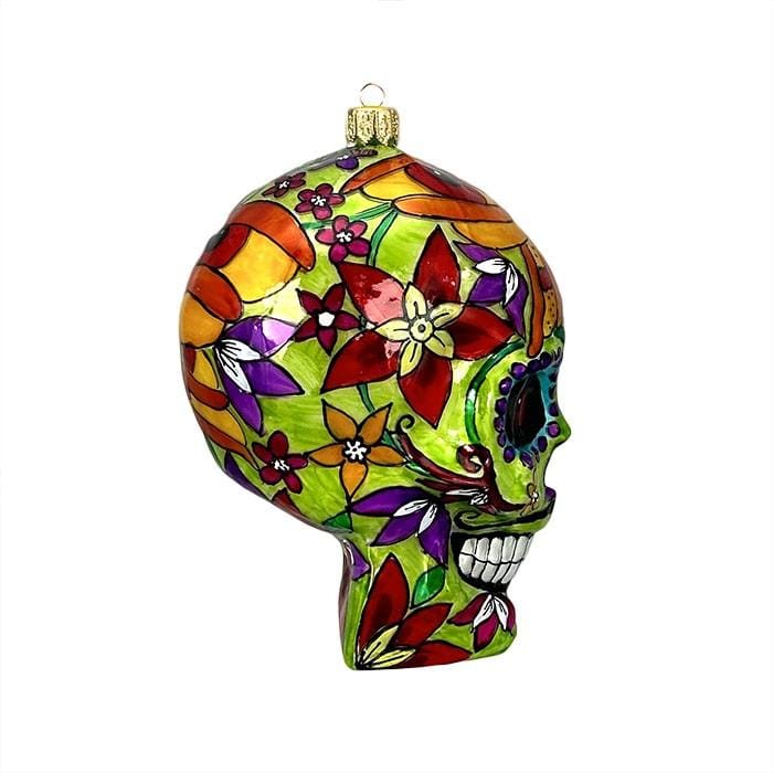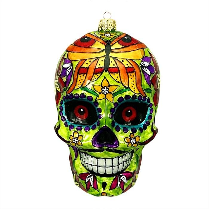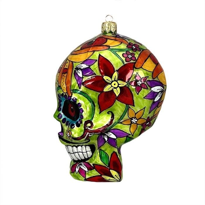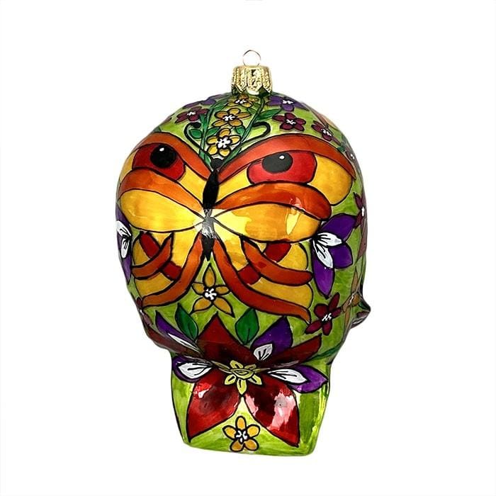 Kerstbal Skull Butterfly is een opvallend, handgemaakt ornament in de vorm van een groene schedel, rijkelijk versierd met bloemen en een grote vlinder op het achterhoofd. Dit kunstwerk van Joyland Factory is geïnspireerd op de Mexicaanse Día de Muertos-traditie en straalt levendigheid, symboliek en vakmanschap uit. Elke kerstbal wordt mondgeblazen en met de hand beschilderd door ervaren ambachtslieden. Het resultaat is een uniek stuk met krachtige kleuren en zorgvuldige details – perfect voor wie houdt van uitgesproken kerstdecoratie met karakter.