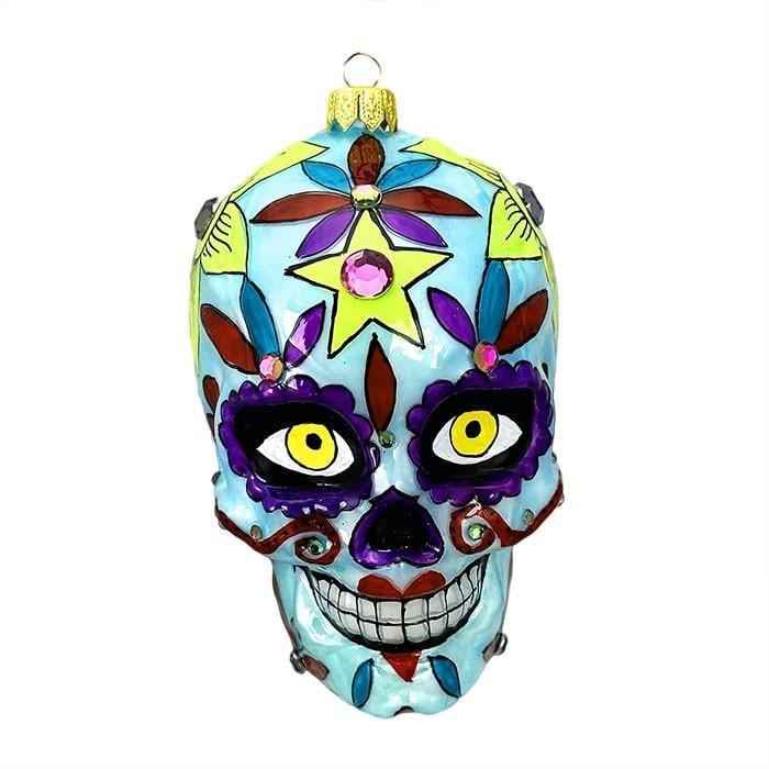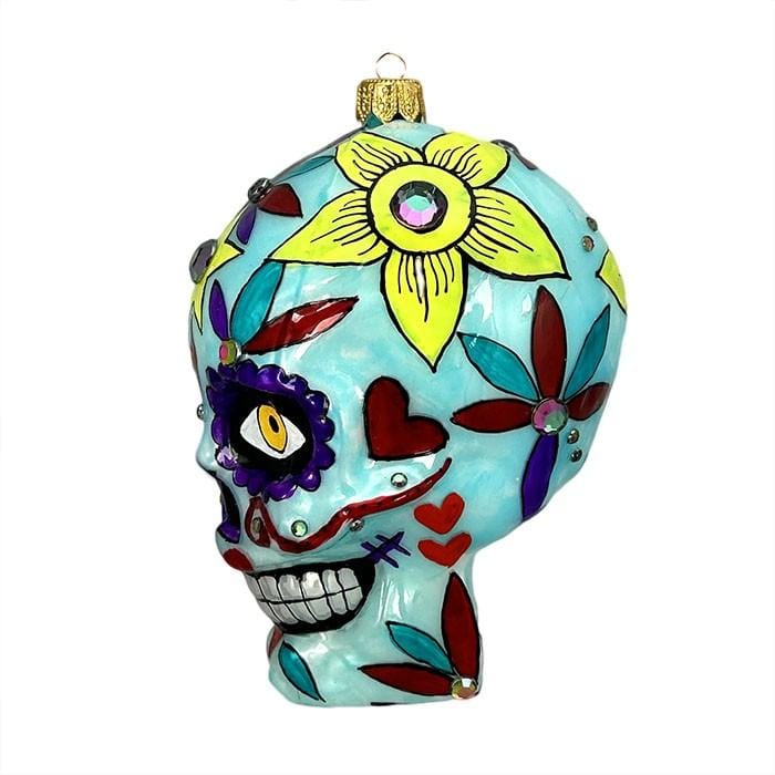 Deze opvallende kerstbal in de vorm van een kleurrijke skull met bloemen is met de hand geblazen en beschilderd door de vakmensen van Joyland Factory in Polen. Het ontwerp is geïnspireerd op Mexicaanse 'Día de los Muertos'-motieven en barst van de details: heldere kleuren, bloemen, hartjes en sierlijke accenten – allemaal met de hand aangebracht. Met een formaat van 13 x 8 x 9 cm is dit ornament een echte eyecatcher in je boom of als los decoratief object. Perfect voor liefhebbers van bijzondere kerstdecoratie, verzamelaars en iedereen die houdt van een uitgesproken stijl.
