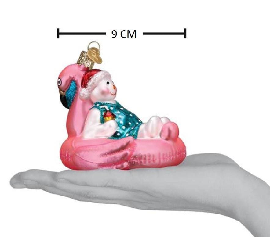 Waar gaat de Sneeuwpop heen op een warme zomerdag? Naar het zwembad natuurlijk! Hun bad is zo koud dat de Sneeuwpop hier zelfs met dertig graden niet weg zal smelten. In zijn Flamingo Zwemband geniet de Sneeuwpop van een verfrissend drankje. Deze glazen Kerstbal van Old World Christmas is zowel in de zomer als winter leuk om op te hangen.