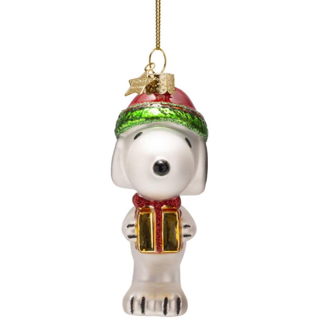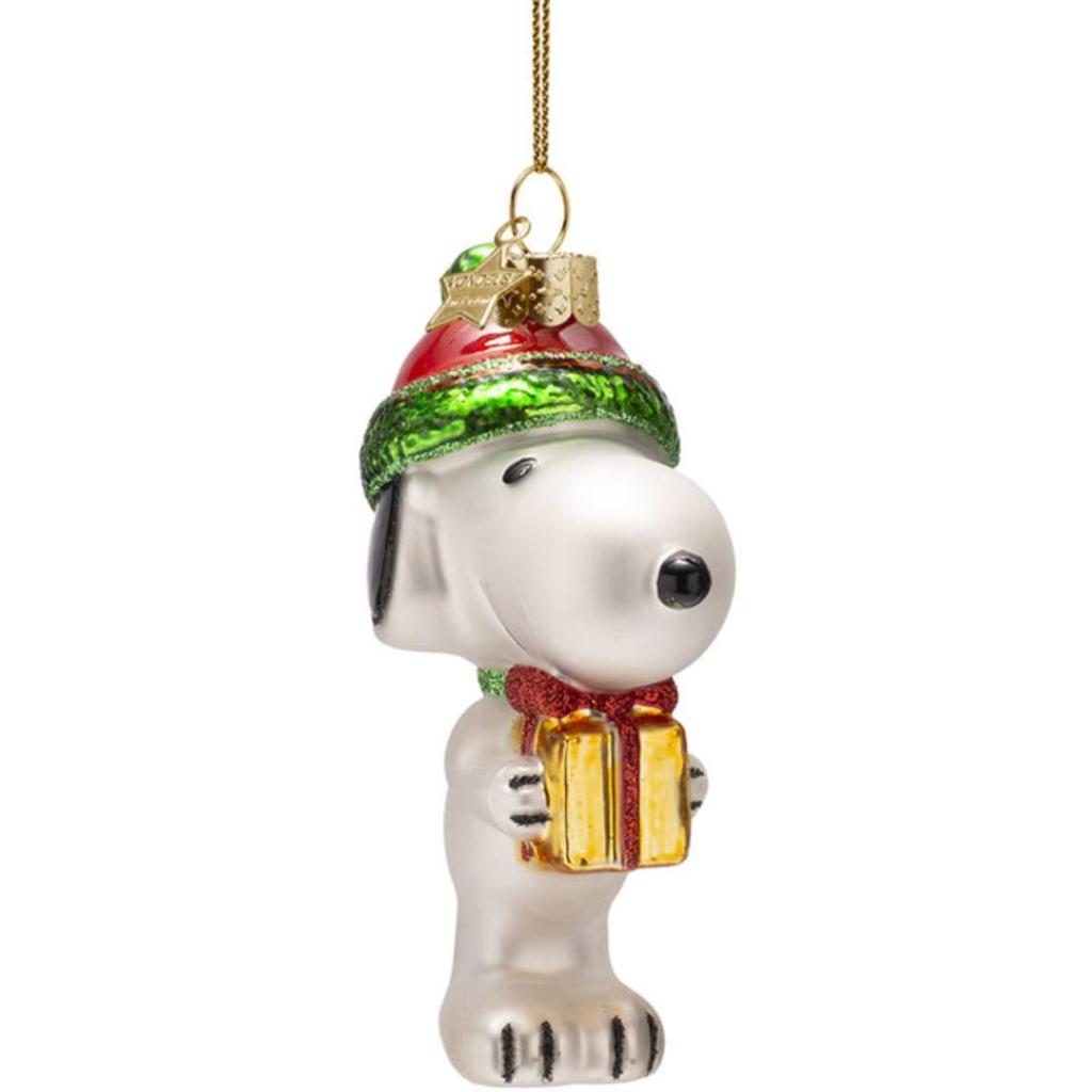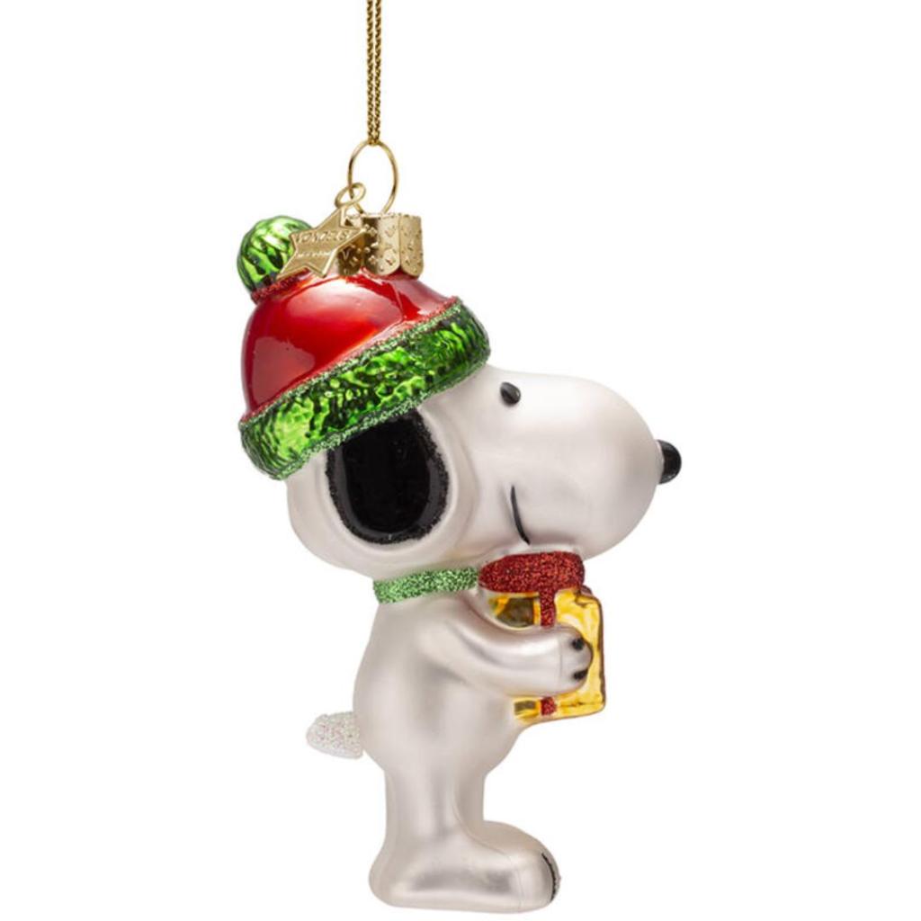 Vrolijk de boom op met dit iconische kerstornament van Snoopy, die een gouden cadeautje vasthoudt en een glinsterende kerstmuts draagt. Het ornament is met de hand geblazen en gedecoreerd, en straalt nostalgie en feestelijkheid uit. Of je nu een Peanuts-fan bent of gewoon op zoek bent naar een unieke blikvanger: Snoopy brengt hoe dan ook een glimlach. Hoogte: 11 cm. Gemaakt van glas.