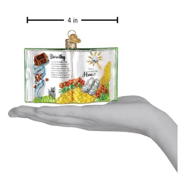 Een klassieker in kerstbalvorm! Dit glazen ornament van Old World Christmas is vormgegeven als het beroemde boek The Wonderful Wizard of Oz. De voorzijde toont een sprankelende open pagina met Dorothy, haar hondje Toto, de gele weg en de iconische zilveren schoenen. Op de achterkant prijkt de originele boekomslag in retro stijl. Elk detail is met de hand beschilderd en met glitteraccenten afgewerkt, waardoor dit ornament een feest is voor het oog én voor fans van het verhaal.
