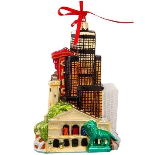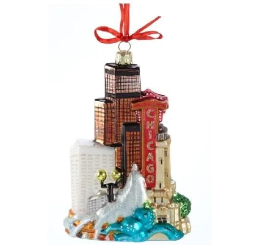 De wereldse cityscape collectie van Kurt Adler biedt een prachtige, gedetailleerde kijk op steden van over de hele wereld, waaronder de thuisbasis van het Chicago Theatre-Chicago, Illinois! Dit glazen ornament is prachtig gedetailleerd met verschillende bezienswaardigheden van Chicago, waaronder de Willis Tower.