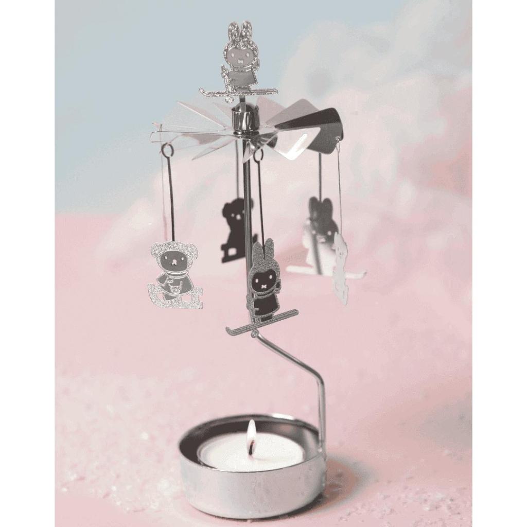 De Angel Chimes Nijntje Winter van Pluto Design brengt direct een gezellige winterse sfeer in huis. Zodra je het theelichtje aansteekt, begint de metalen waaier te draaien en komen de zilverkleurige hangers – waaronder Nijntje op ski’s en Boris op de slee – zachtjes in beweging. Een knus winters tafereel dat perfect past bij het seizoen. Het lichte ontwerp maakt deze draaimolen ideaal voor op tafel, in de vensterbank of in een kinderkamer. De combinatie van glanzend metaal en fijne details geeft een moderne, Scandinavische uitstraling. Let op: laat kaarsen nooit onbeheerd branden en houd brandbare materialen op veilige afstand.