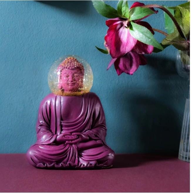 Staat voor geluk en kennis in de zin van de boeddhistische leer en transformeert elke ruimte in een harmonieuze oase van rust. Kortom een Buddha sneeuwbol met een hoog glitter gehalte. Eerder hadden we al een witte uitvoering, deze donkerpaarse is nog rustgevender.