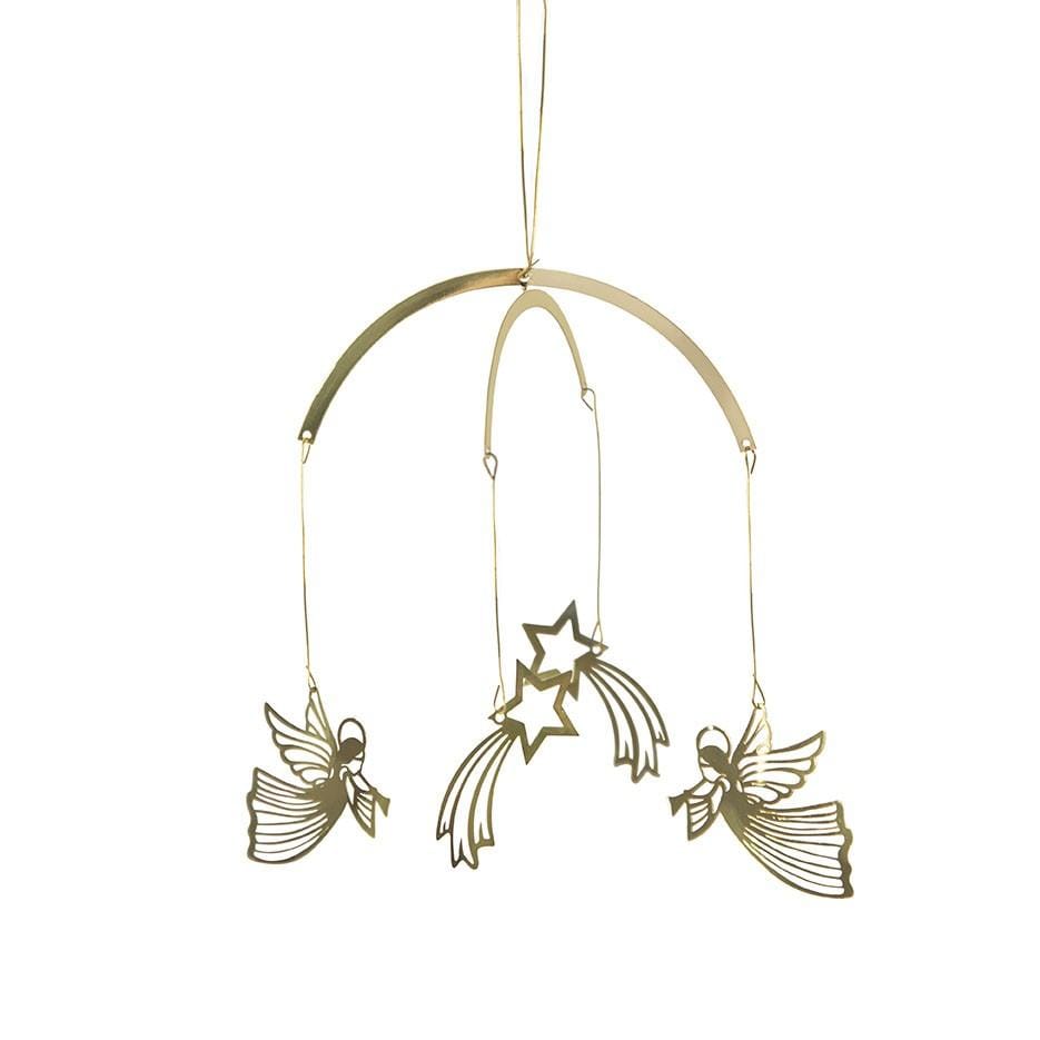 Een prachtig mobiel van vliegende engelen en sterren van glanzend goudkleurig metaal.