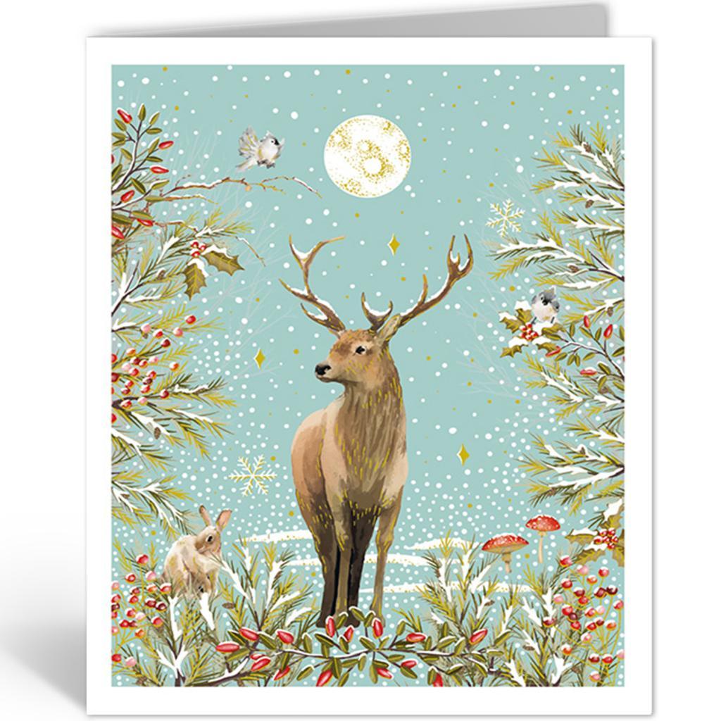 In het stille winterbos staat een trots hert onder de volle maan. Om hem heen fladderen vogeltjes en sluipt een konijn nieuwsgierig dichterbij. Een sfeervolle kerstkaart die warmte brengt in elk seizoen.