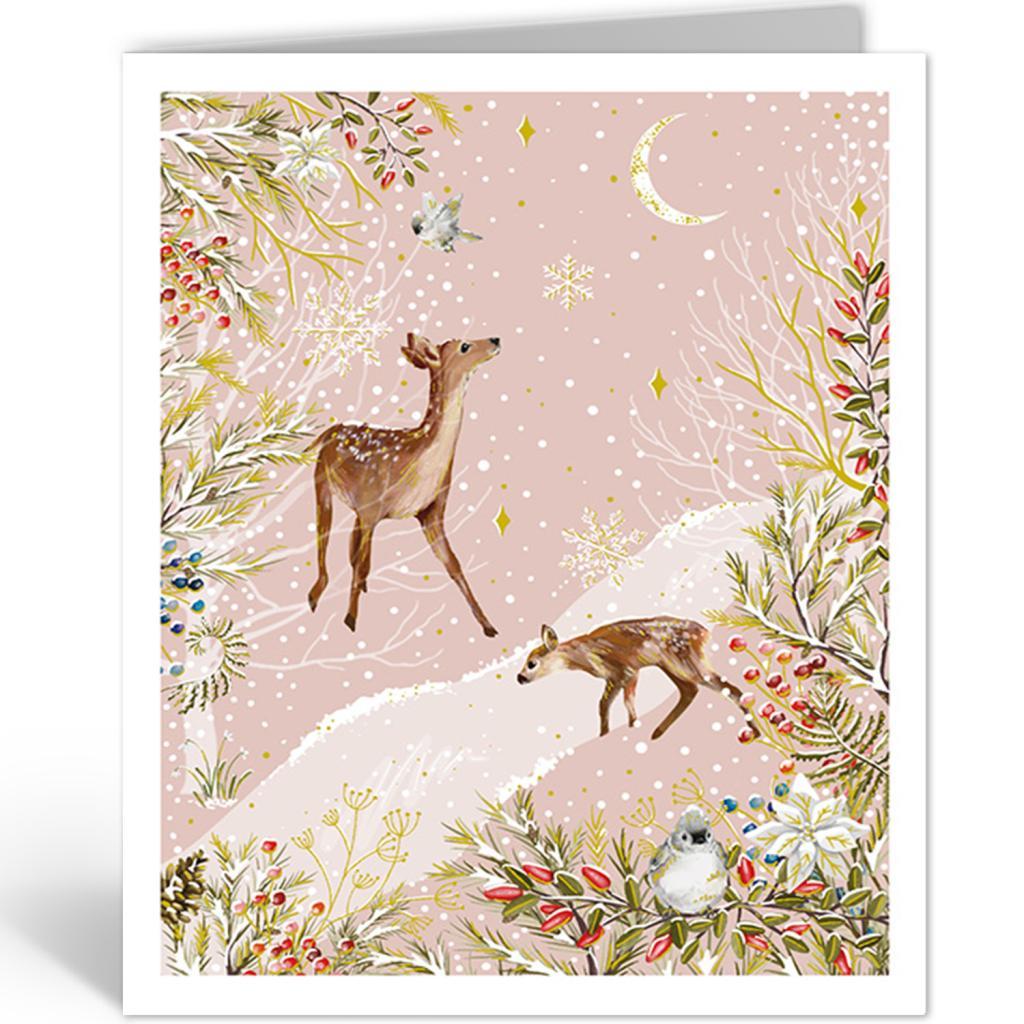Twee hertjes stappen voorzichtig door het besneeuwde bos, onder het zachte licht van de maan. Een dromerige kerstkaart vol rust, natuur en een vleugje magie. Inclusief enveloppe.