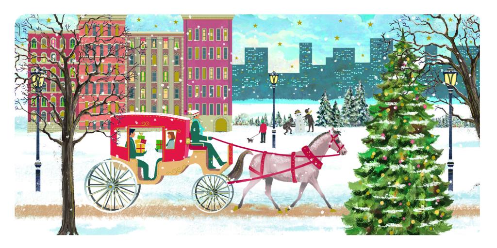 Een sfeervolle kerstkaart die de charme van een winterse stad perfect vastlegt. Een sierlijke kerstkoets, getrokken door een prachtig versierd paard, rijdt door een besneeuwd park. Op de achtergrond zie je kleurrijke gevels, verlichte ramen en de skyline van de stad. Aan de rechterkant staat een grote kerstboom vol lichtjes en ornamenten, terwijl wandelaars en schaatsers genieten van het winterse weer. De kaart is gedrukt op stevig karton met een heldere, hoogwaardige print en wordt geleverd met een rode envelop. Een elegante kaart voor iedereen die houdt van een klassieke kerstsfeer.