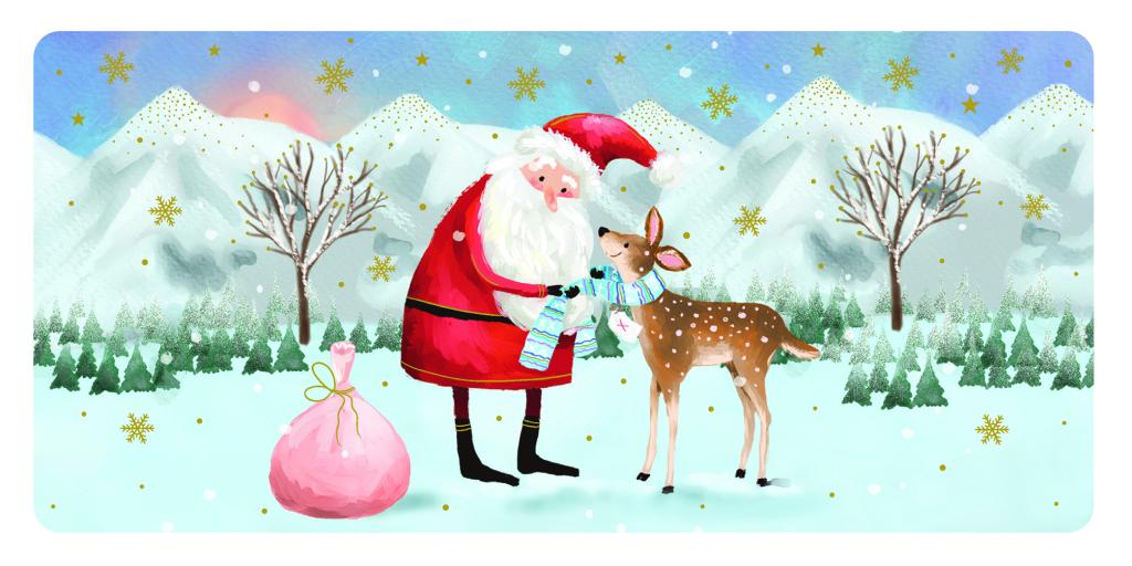 Een sfeervolle postkaart van Les Enchantées, waarin de Kerstman een vriendelijk hert ontmoet in een prachtig winters berglandschap. Omringd door besneeuwde dennen, zachte sneeuwvlokken en glinsterende gouden accenten straalt deze illustratie warmte en rust uit. Zijn zak met cadeautjes ligt naast hem in de sneeuw, terwijl hij het hert liefdevol een geschenkje overhandigt.
