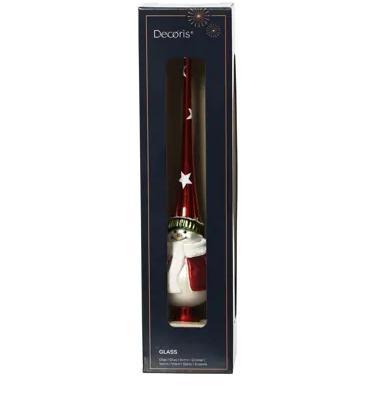 Deze vrolijke kerstpiek met sneeuwpop brengt een speelse wintersfeer in je kerstboom. De piek is gemaakt van glas en heeft een glanzende rode top met witte sterren, terwijl de basis een charmante sneeuwpop toont met witte en groene details.