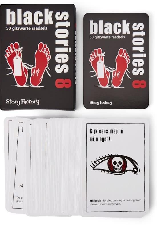 Durf jij de duisternis in te stappen? Black Stories 8 is er met 50 gloednieuwe, bizarre en macabere verhalen die je tot het uiterste zullen testen. In dit coöperatieve raadselspel nemen spelers om beurten de rol van de Verteller op, die de details van een gruwelijk sterfgeval kent. De andere spelers, de Detectives, moeten door slimme ja/nee vragen te stellen de waarheid achter de gebeurtenissen ontrafelen. Black Stories 8 neemt je mee naar duistere plekken en griezelige scenario's. De verhalen zijn gebaseerd op waargebeurde gebeurtenissen, wat ze des te angstaanjagender maakt. Gebruik je deductievermogen, je creativiteit en je teamwork om de mysteries op te lossen. Lukt het jullie om de waarheid te achterhalen voordat het te laat is?