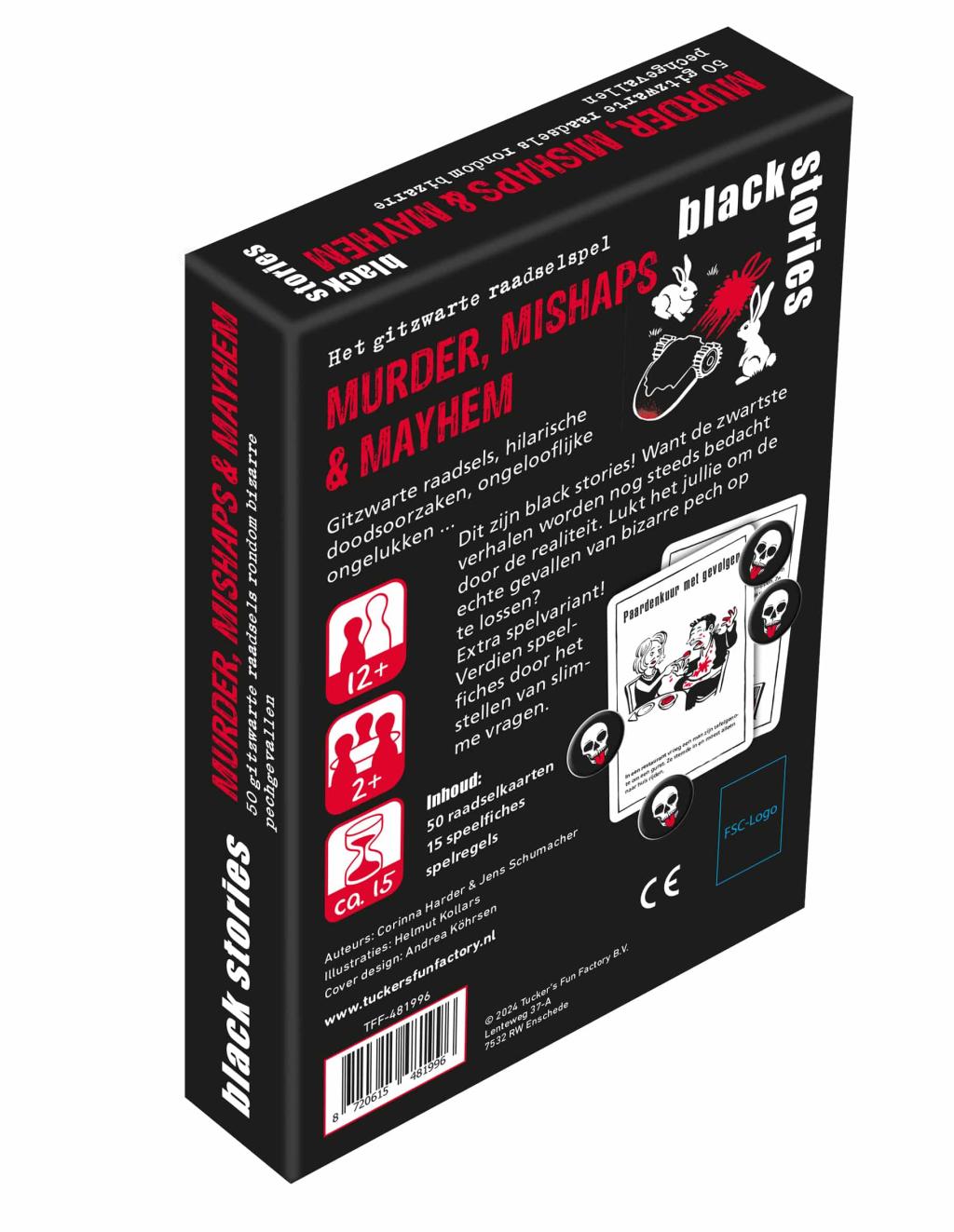 Bereid je voor op een spel vol gitzwarte raadsels, hilarische doodsoorzaken en ongelooflijke ongelukken met Black Stories - Murder, Mishaps & Mayhem. De meest bizarre en zwarte verhalen komen rechtstreeks uit de realiteit en dagen jullie uit om ze op te lossen. Kunnen jullie de mysteries achter deze macabere pechgevallen ontrafelen?