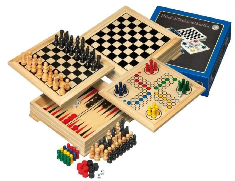 Er zitten 4 verschillende klassiekers in; schaken,dammen,backgammon en een dobbelspel.