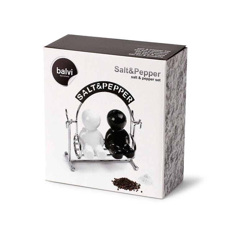 Peper- en Zoutstel Schommel – Keramiek & RVS – 12,5 x 12,5 x 5 cm – Design van Balvi Barcelona