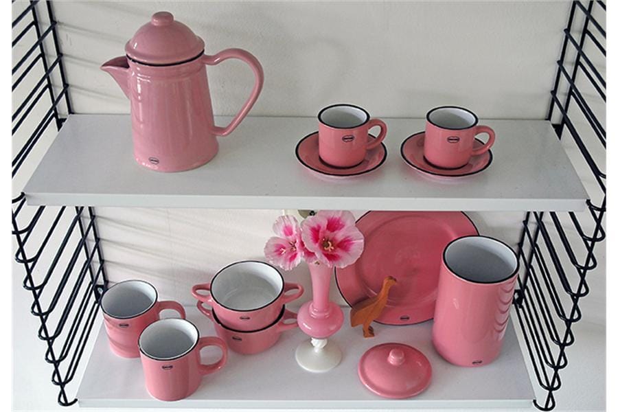 Wanneer je niet beter weet denk je dat deze mokken gemaakt zijn van emaille. Wanneer je de mokken oppakt om uit te drinken blijken ze echter van keramiek te zijn. Wel zo handig aangezien je deze mokken dus wel veilig in magnetron of vaatwasser kunt zetten. Leuk om te combineren met de bijpassende Thee- of Koffiepot en het Melk en Suikerset.