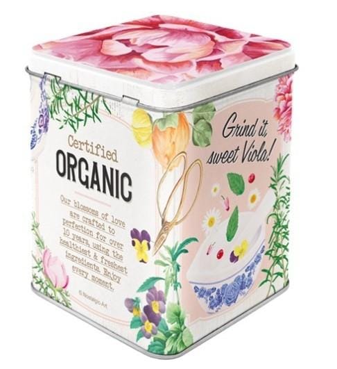 Dit prachtige retro blik met de afbeelding van een bloeiende theebus is de perfecte opbergplaats voor jouw favoriete kruidenthee. Het nostalgische ontwerp en de zachte kleuren maken het blik tot een sieraad in elke keuken.