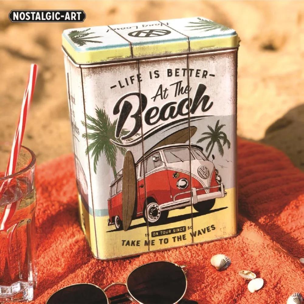 Droom je van zon, zee en vrijheid? Dit vrolijke bewaarblik met vintage Volkswagen T1 bus en surfsfeer brengt het strandgevoel naar je keuken. Het robuuste metalen blik toont een rode VW bus met surfplank, palmbomen en inspirerende teksten zoals "Life is better at the beach". Ideaal om je koekjes, koffie of vakantiegeld in te bewaren – of gewoon als stijlvol decoratiestuk.