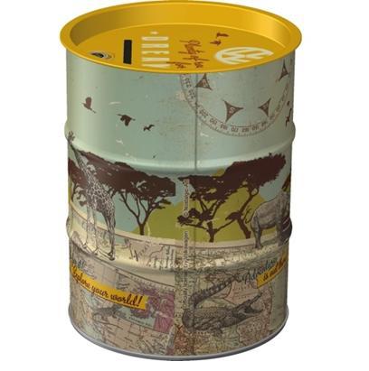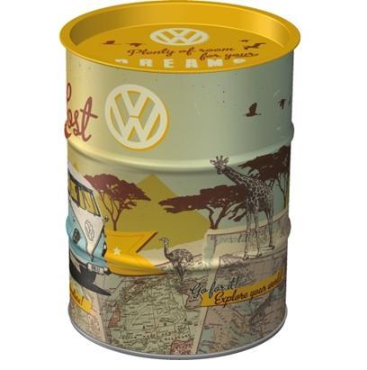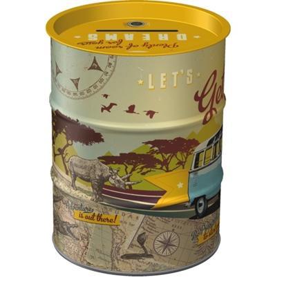 Dit Volkswagen spaarblik van Nostalgic Art is uitgevoerd in de vorm van een mini olievat en heeft een stoer retro ontwerp. De print toont een klassiek VW busje in safari-stijl, compleet met giraffen, neushoorns en een vintage landkaart. Met de tekst “Get Lost” en “Be prepared to start your own adventure” ademt dit blik reislust en avontuur.