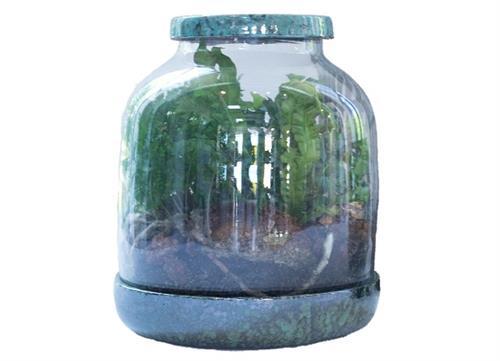 Breng groen en stijl samen met de Terrarium Vaas met Keramische Deksel Mani L! Deze unieke vaas combineert een elegant glazen ontwerp met een keramische deksel en onderkant, beide afgewerkt met een prachtige reactieve groene glazuurlaag. Met een royale diameter van 26 cm en een hoogte van 29 cm is deze vaas ideaal om een terrarium te creëren of als decoratief item in je interieur. Een verfijnde keuze voor plantenliefhebbers en designfans die houden van een vleugje natuur in huis.