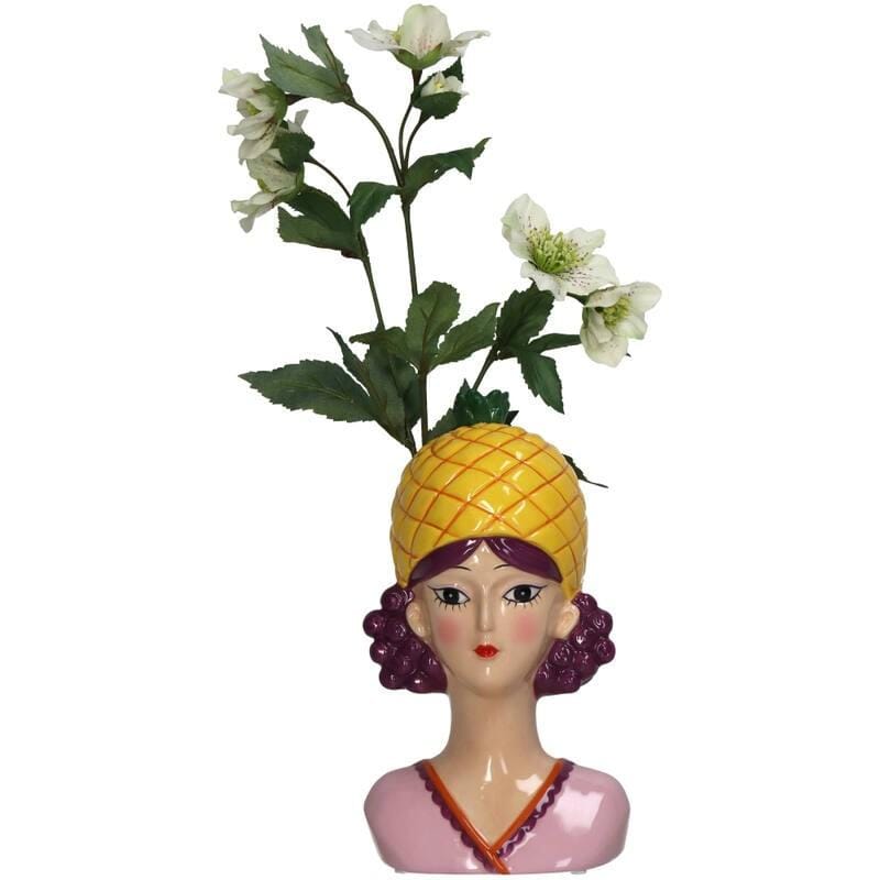 Vaas Dame Ananas H25 is een uitgesproken en speelse vaas met een vrouwelijke buste en een opvallende ananasvormige hoed. De combinatie van zachte kleuren, glans en het fruitdetail zorgt voor een eigenzinnige uitstraling die direct de aandacht trekt.