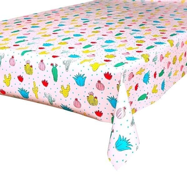 Dit speelse tafelzeil heeft allerlei cactussen in de kleuren geel, blauw, roze en meer. De blauwe stippen in de achtergrond maken dit kleurrijke patroontje af. Door het stevige PVC is dit zeil bestand tegen de meest rommelige knutselsessies en zijn vlekken van verf en omgevallen drankjes gemakkelijk te verwijderen.