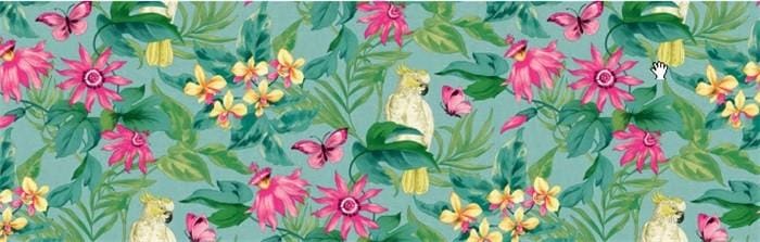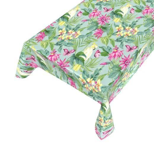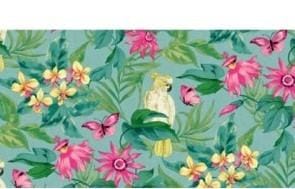 Tafelzeil Montego Bay – Tropisch dessin met kaketoe, bloemen en bladeren, 140 cm breed, per 10 cm van de rol